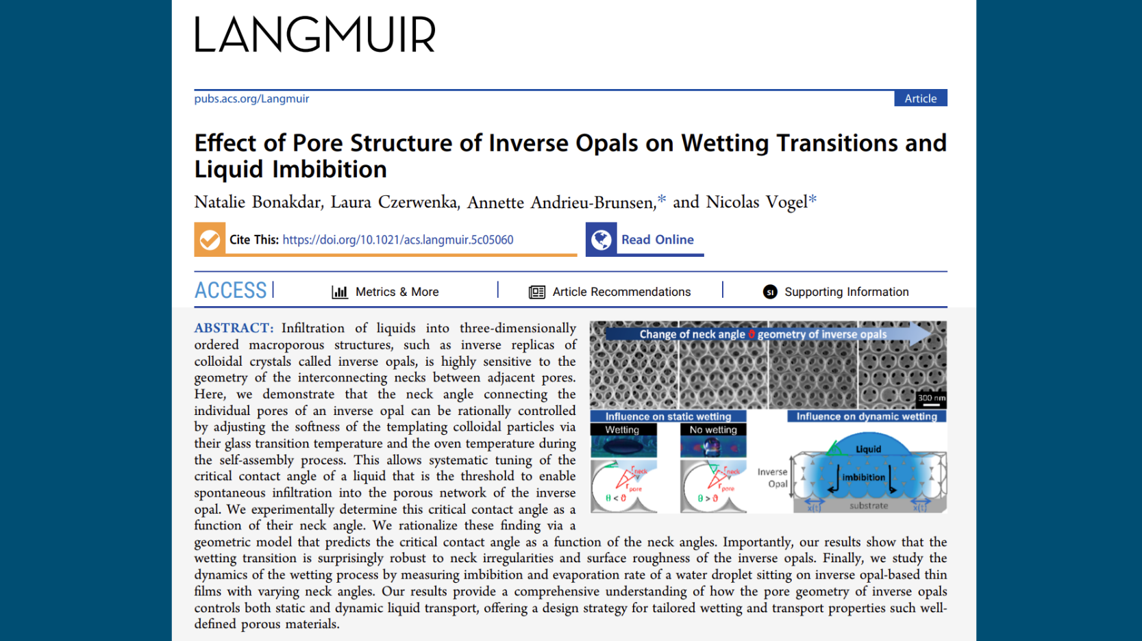 Please check out the new article on the Effect of Pore Structure of Inverse Opals on Wetting Transitions and Liquid Imbibition, a collaboration with the group of Prof. Vogel FAU Erlangen funded by the DFG.