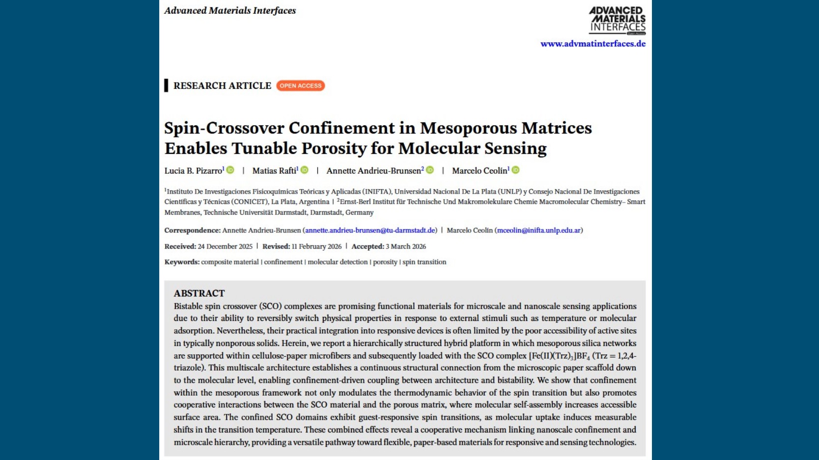 We are proud to share our new article about Spin-Crossover Confinement in Mesoporous Matrices Enables Tunable Porosity for Molecular Sensing.